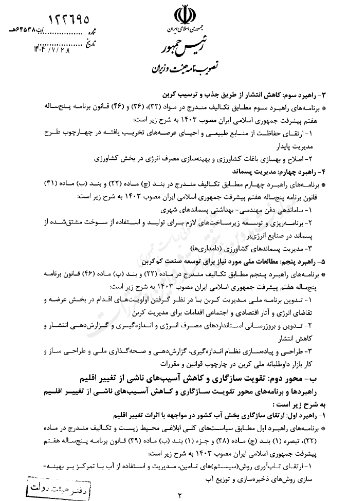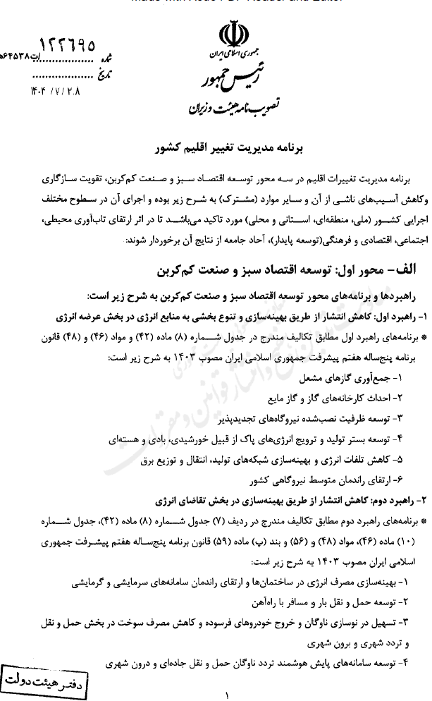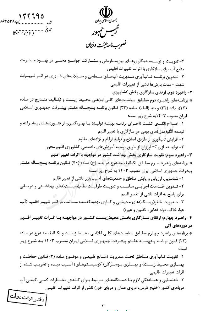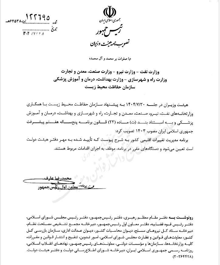 به گزارش بازار انرژی از تصویب نامه هیات وزیران، در جلسه ۲۰ مهر ۱۴۰۴ به پیشنهاد سازمان حفاظت محیط زیست با همکاری وزارتخانههای نفت، نیرو، صنعت معدن و تجارت، راه و شهرسازی و درمان و آموزش پزشکی و به استناد بند طی ماده ۲۲ قانون برنامه ۵ ساله هفتم پیشرفت جمهوری اسلامی ایران مصوبات اقلیمی کشور به دستگاههای مقرر قالب برنامه و جهت اجرا ابلاغ گردید.